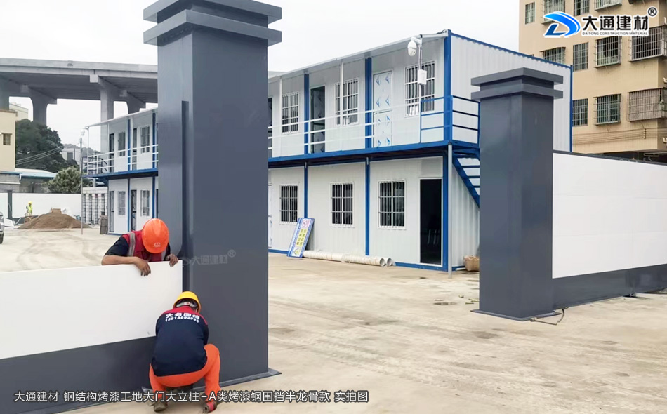 上圖是 深圳市大通建材的鋼結構烤漆工地大門立柱與A類烤漆鋼圍擋半龍骨款 正面實拍圖