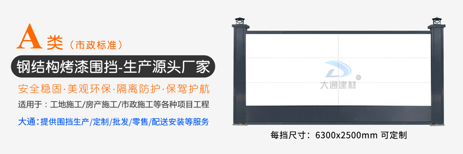 深圳市大通建材公司專業從事烤漆板鋼結構圍擋、鍍鋅板鋼結構圍擋、PVC板圍擋等集工程圍擋承接、施工一體的深圳鋼結構圍擋生產廠家,為各施工單位提供烤漆板鋼結構圍擋、鍍鋅板鋼結構圍擋、PVC板圍擋等施工圍擋的生產批發與施工服務,咨詢電話:13826562448