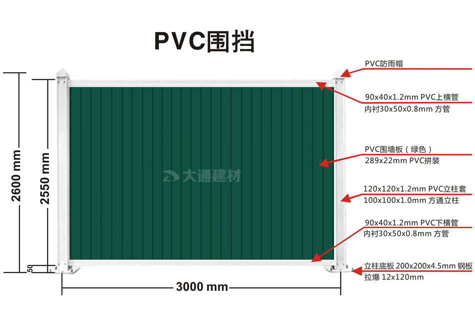大通不同顏色的PVC圍擋之間最大區(qū)別是PVC圍墻板的顏色不一樣,相同地方是:PVC圍擋的圍墻板都是PVC長條版拼接,立柱、橫管均為白色PVC材料,內(nèi)部均襯塑鋼方通,立柱底板為鋼板,并加斜支撐,增加受力,確保更安全穩(wěn)固。