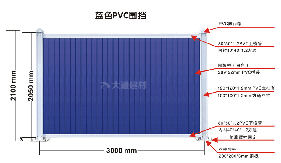 上圖展示的是大通藍(lán)色PVC圍擋 規(guī)格參數(shù)圖