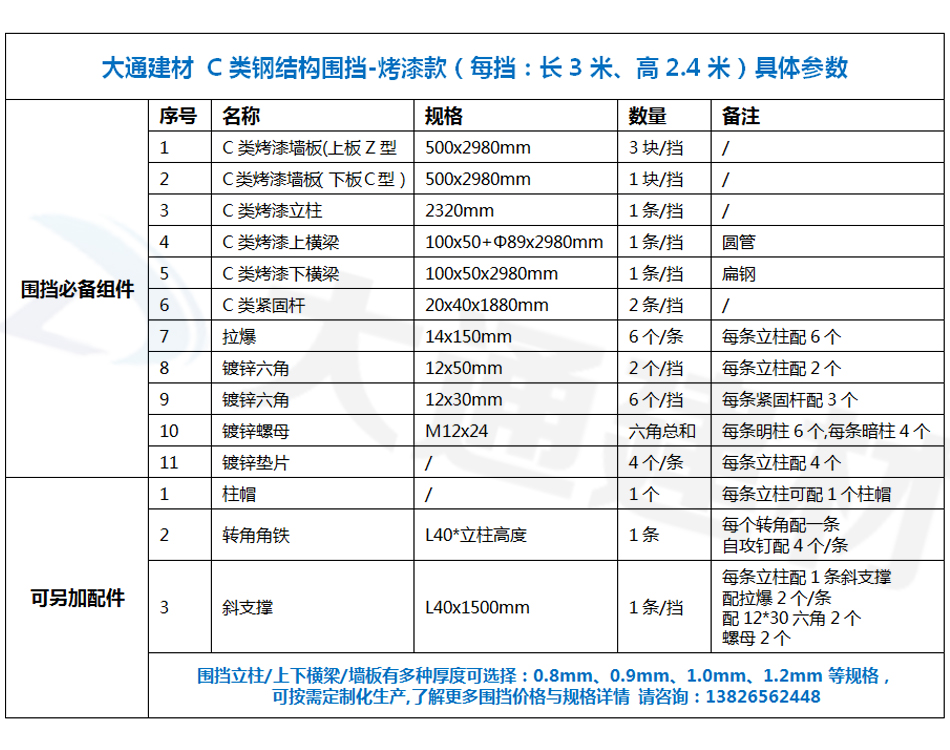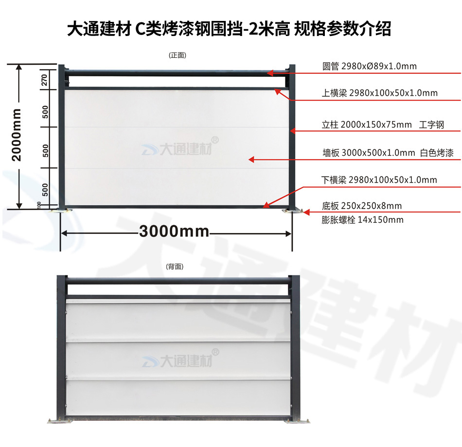 大通建材C類裝配式鋼結(jié)構(gòu)圍擋-烤漆款的烤漆鋼板厚度是0.8mm,采用150*75mm工字鋼立柱,同時(shí)每一擋圍擋的長度都是3米,高度是2.4m,其它具體參數(shù)規(guī)格請參照上述展示的圍擋參數(shù)圖。